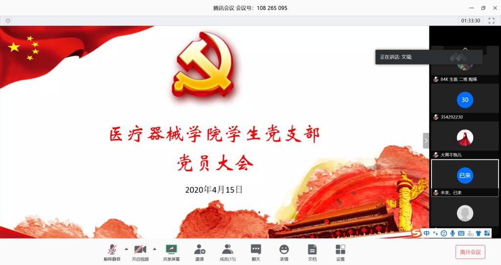 4月15日,学生党支部召开了线上党员大会。全体党员认真学习了2020年1月8日习近平总书记在“不忘初心、牢记使命”主题教育总结大会上的讲话,対校党委印发的《学习贯彻习近平总书记在“不忘初心、牢记使命”主题教育总结大会上的重要讲话的实施方案》文件进行了解读,并将其作为今年支部重点学习内容,要求全体党员不断深化认识、提升意识、凝聚共识,对标“六大成果”认真进行自我检视反思,研学“六条经验”深化主题教育理论成果,同时加强党的理论知识及党章党史的学习,加强自我检视力度,及时发现问题,认真整改问题,努力提高政治素养。
