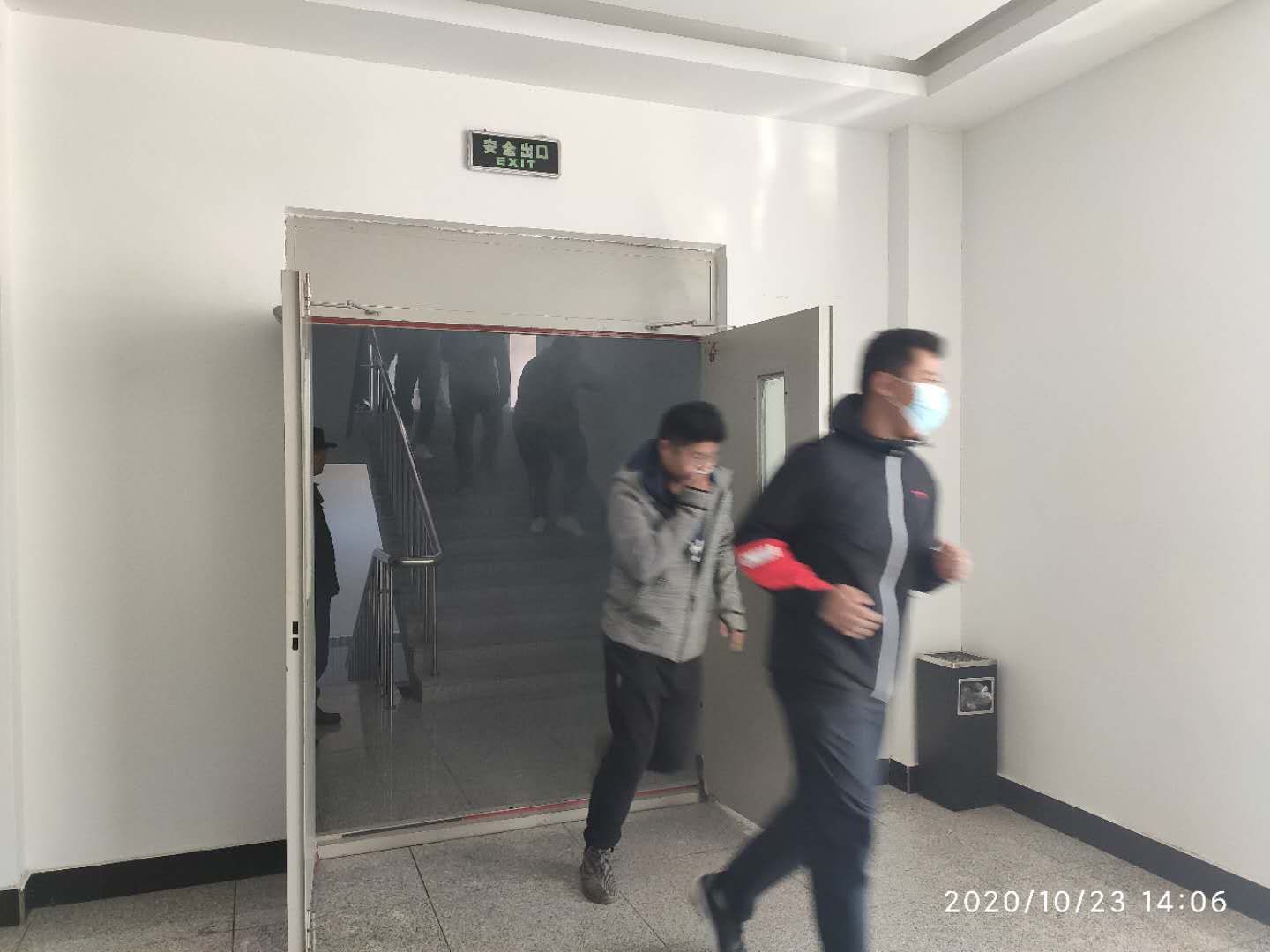 演练开始,报警小组点燃烟饼并发出逃生信号,学生在各楼层听到逃生信号后开始进行疏散,大家按照要求弯着腰、猫着步,用湿手帕、口罩等捂住口鼻,沿着疏散通道快速有序地撤离到安全地带。学生安全疏散完毕,消防安全工作老师为大家分发安全教育宣传页。赵宏格书记根据整个演练过程发现的问题进行了针对性总结教育,再次强调火灾逃生关键点,加强学生的安全防范教育。