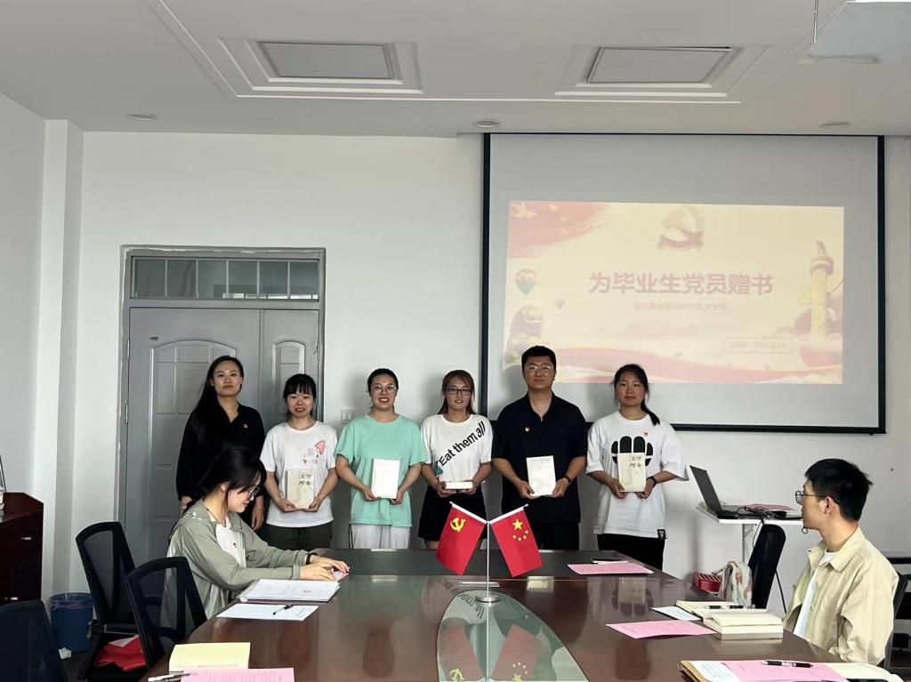 接下来,党支部面向全体毕业生党员开展“廉洁从业,勿忘初心”教育警示会。组织全体党员观看廉洁从业警示教育专题片《温水煮青蛙》,随后由研三毕业生党员吉冰洁宣读廉洁从业承诺书,并组织全体毕业生党员签订承诺书,筑牢党员思想根基。研一党员赵美妮为全体毕业生党员赠言,祝愿各位师兄师姐能够保持热爱,以梦为马,披荆斩棘,前路浩荡,未来可期。研究生党支部书记代明阳老师为毕业生党员赠书。