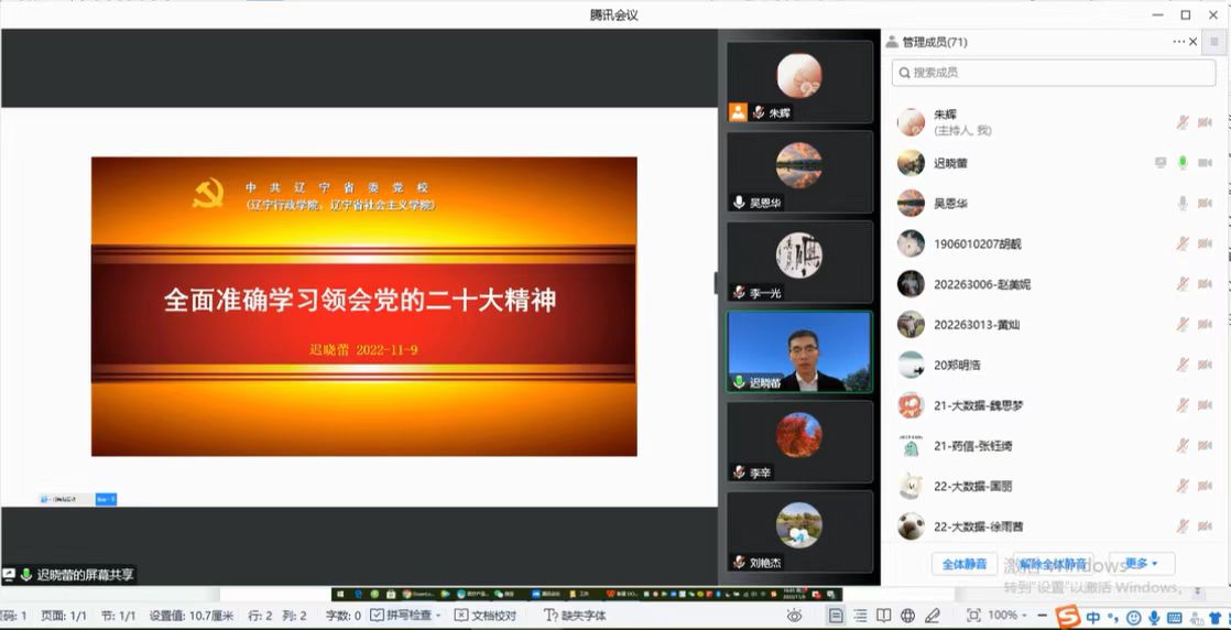 为深入学习贯彻党的二十大精神,深刻领会和把握党的二十大精神的思想精髓和核心要义,11月9日,jdb电子游戏官方网站党委召开线上政治理论中心组(扩大)学习会,专题学习贯彻党的二十大精神,邀请省委党校迟晓蕾副教授做题为“全面准确学习领会党的二十大精神”讲座,学院全体教师及学生党员参加会议,学院党委书记吴恩华主持会议。