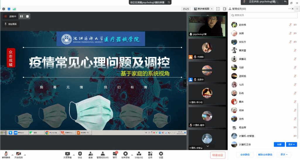 为进一步缓解疫情防控期间全院教职工居家办公的心理压力,做好疫情期间的心理调适,提高心理健康水平,jdb电子游戏官方网站于4月13日,面向全院教职工开展线上心理健康讲座。本次讲座邀请到沈阳体育学院运动人体科学学院副教授,应用心理学博士窦广波,为全院教职工做题为《疫情常见心理问题及调控——基于家庭的系统视角》专题辅导讲座,学院全体教师参加了本次讲座。