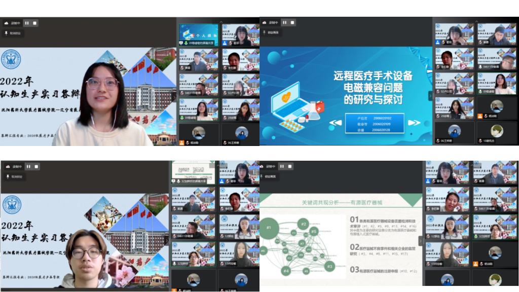 为及时分享学生在本次认识生产实习的收获与感悟。4月15日上午,学院召开了2021-2022学年下学期医疗产品管理专业认识生产实习答辩汇报会议。辽宁省医疗器械检验检测院专家孙智勇、jdb电子游戏官方网站副院长崔勇、基础与信息学系主任李佐静、专业负责人项荣武及部分教师出席会议。会议由翟菲主持。答辩专家组组长孙智勇主持答辩流程,同学分9组答辩并回答专家提问,其中第五组“远程医疗手术设备电磁兼容问题的研究与探讨”和第九组“有源医疗器械共现分析文献解读”在展示美观性、汇报逻辑性、准备充分性和语言流畅性得到专家组的一致认可和表扬;我院副院长崔勇代表学院,感谢辽宁省医疗器械检验检测院对我院认识生产实习的大力支持,并作实习教学总结。总结中提到2020级认识生产实习,相较于去年质量更高、内容更广、形式更新,通过专家、带教教师、学生的共同努力,为“疫情大考”背景下教学模式的探索提供了成功范例。