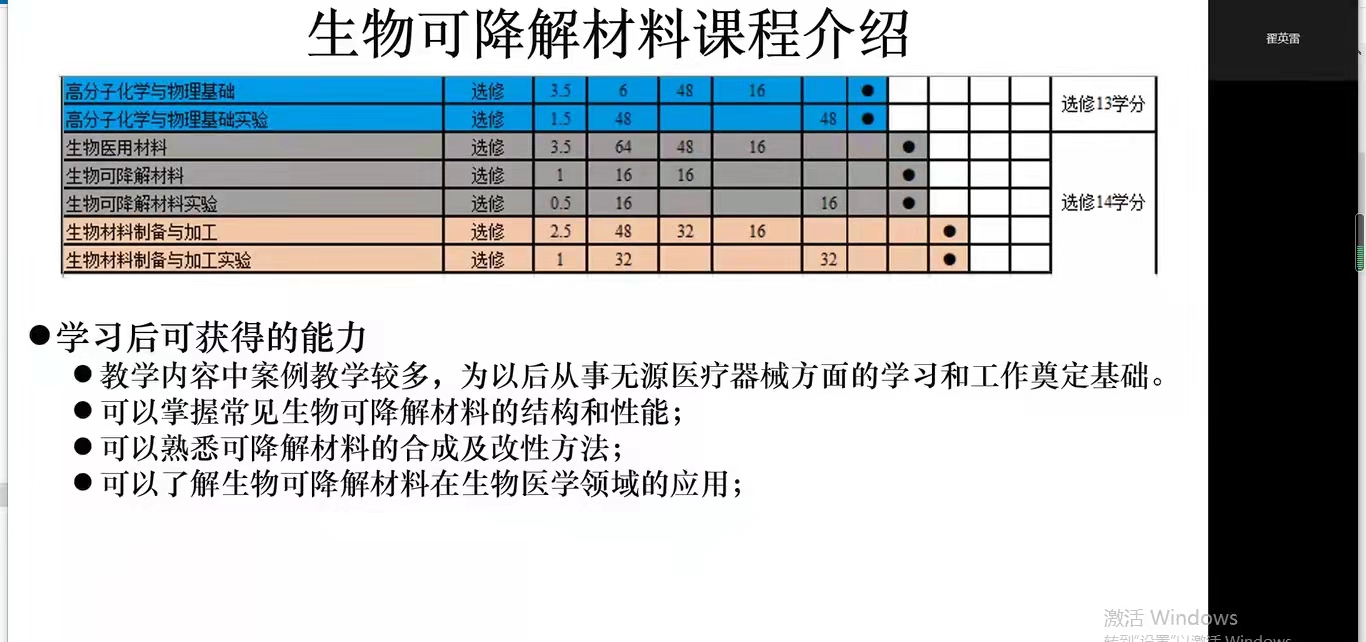王超老师结合专业知识与生活实例对生物医用材料课程进行生动且深入的介绍,使学生对生物材料基础理论、近年来前沿进展、产业化现状及发展方向有一个初步的认识。