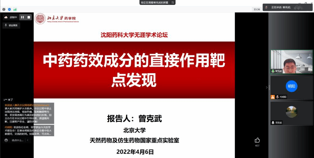 4月6日,由研究生院、辽宁省药学研究生创新与学术交流中心、jdb电子游戏官方网站联合举办的“沈药无涯论坛”第278讲——曾克武学术报告会于线上如期举行。会议邀请到我校66K校友、北京大学曾克武研究员做题为《中药药效成分的作用靶点发现》的学术报告。报告会由jdb电子游戏官方网站副院长项荣武主持,200余名师生在线收看。