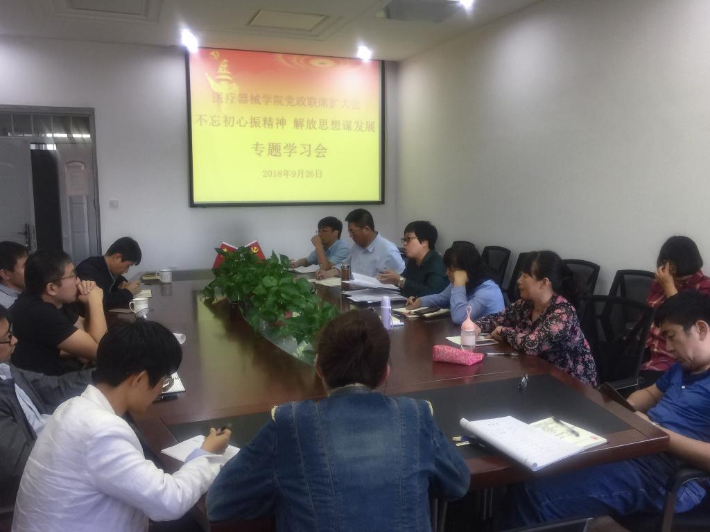 9月26日,jdb电子游戏官方网站在院党群工作室召开党政联席(扩大)会,开展“不忘初心振精神解放思想谋发展”专题学习。院领导班子全体成员、院党委委员、系主任、教研室主任、实验中心主任、教师代表参加了本次专题学习会,会议由院党委书记李哲主持。