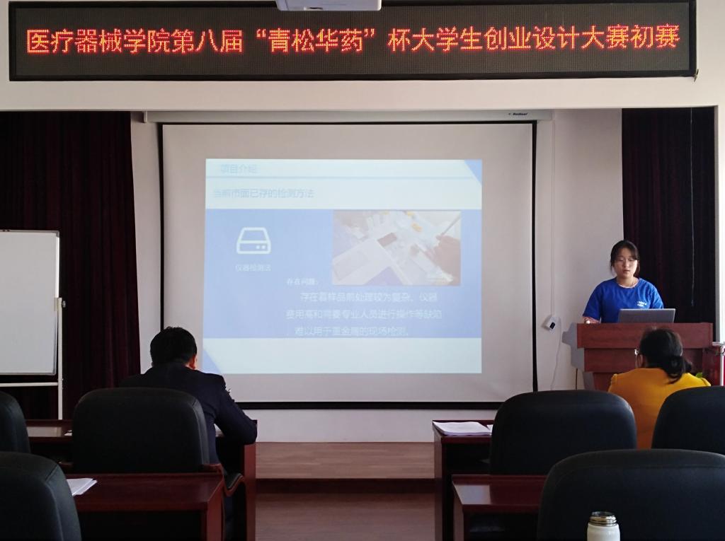 初赛于当日13:00正式开始,共有八支参赛队伍,选手们用心灵和智慧展望美好的未来,用希望和激情点燃创业的梦想。各选手分别通过制作策划书、演讲解说、PPT展示等板块,对自己的创业之路进行了展示。其中,“protectors”团队的研发产品为“蒂芬斯感冒诊断包”,两名团队代表从六个方面进行了阐述,详细介绍了产品的原理,即检测病毒、真菌和细菌的特有物质来判断发病病因。另外,本次大赛最夺人眼球的项目当属研制“果蔬残留重金属的快速检测剂”团队,演讲伊始,他们首先分析了项目的背景,即目前我国重金属在自然界中具有很长的半衰期并且不能被分解,随后详细介绍了产品有前期处理过程简易、产品小巧易携带等优势,最后分析了产品面临的问题。比赛临近尾声,主持人宣读了八组队伍的成绩,并由指导教师为所有参赛团队颁发奖品。比赛也在热烈的气氛中拉下了帷幕。