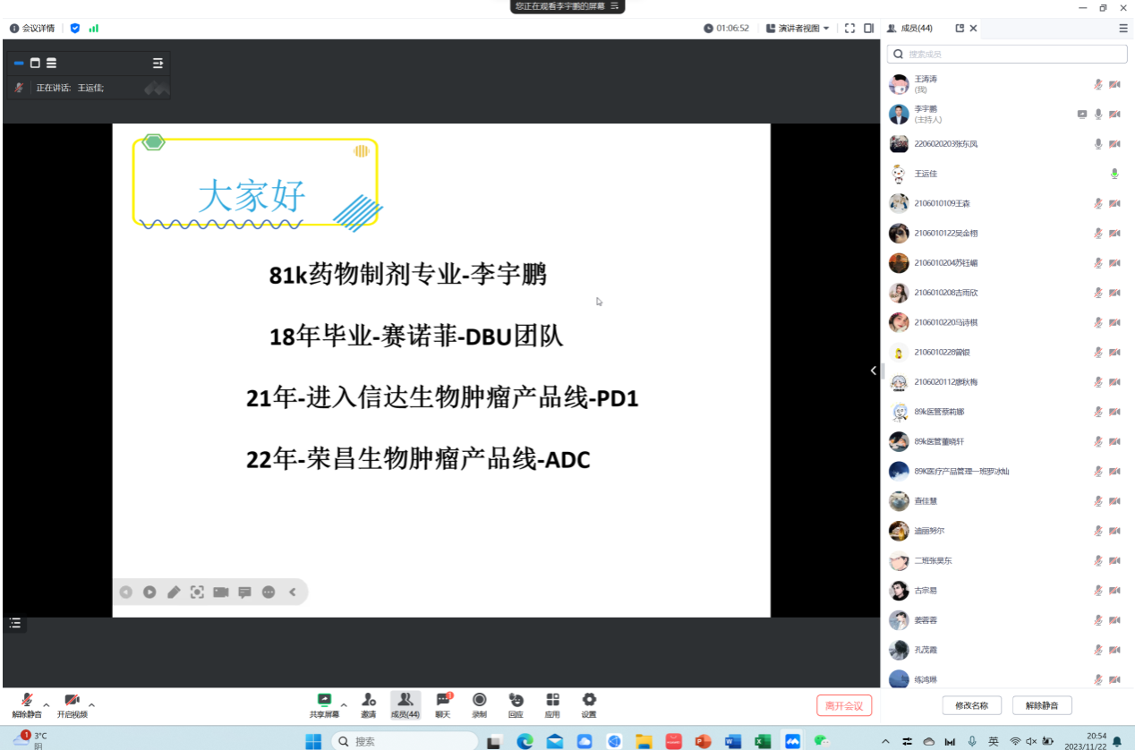 本期讲座邀请到我校81K校友-瑞美京医药科技有限公司市场部经理李宇鹏为同学们带来职业定位及职业发展规划分享,活动由辅导员王运佳主持。