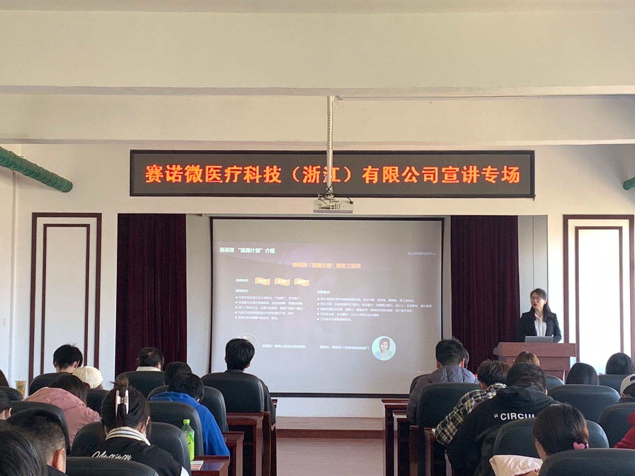 为充分发挥校园招聘主渠道作用,帮助毕业生“就好业”2023年4月26日的下午,jdb电子游戏官方网站邀请赛诺微医疗科技(浙江)有限公司到学院举行春季招聘专场,为毕业生提供“点对点”就业岗位推荐服务,学院全体毕业生及其他年级有就业意向的学生参加了此次招聘宣讲会。
