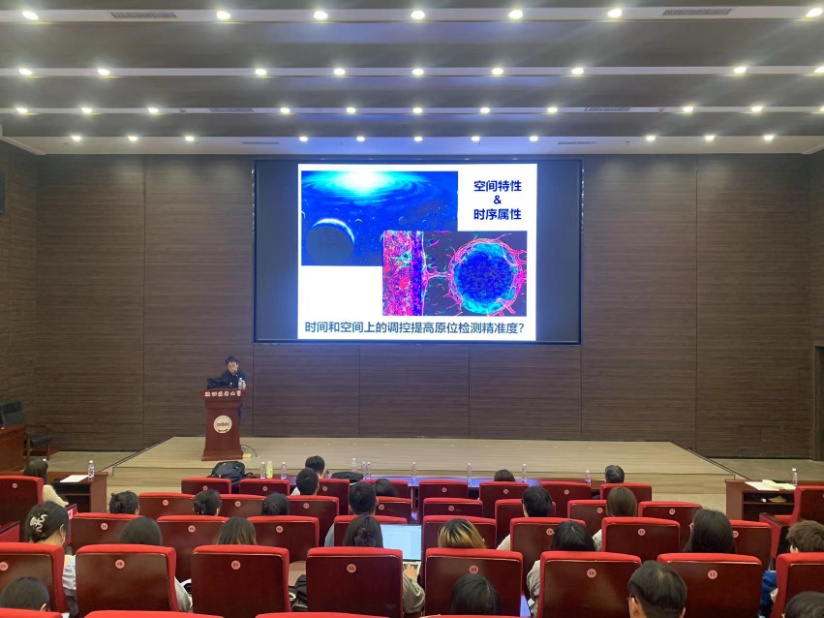 李乐乐团队提出了一种全新的时空选择性分子成像概念,这一概念基于细胞内关键生物分子的变化、代谢与疾病相关途径通常处于亚细胞水平这一特点。他们构建了一种细胞器-活细胞-活体跨尺度精准分子成像新方法,这在生物医学领域具有重要的科研价值和应用前景。李乐乐研究员重点阐述了微酸调控的肿瘤细胞外选择性分子成像、内源性调控实现肿瘤细胞选择性分子成像等研究内容。这些研究成果不仅为肿瘤的早期诊断和治疗提供了新的策略,也为精准医学的发展贡献了重要力量。专题报告深入浅出,不仅让在场的师生对时空选择性分子成像有了更深入的理解,也激发了大家对纳米科学和精准医疗研究的兴趣。报告结束后,李乐乐研究员与在场师生进行了互动交流,对提出的问题给予了耐心细致的解答。
