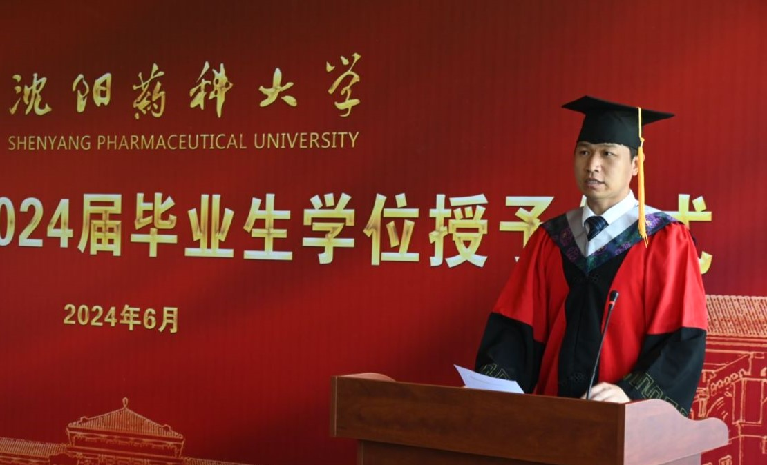 毕业生郭佳代表全体毕业生发言。郭佳深情地表达了对母校、师长诚挚的敬意和衷心的感谢,并表示一定不负祖国、母校所托,始终保持迎难而上、笃定前行的勇气,做新时代主动担当的奋斗者,以青春之我、奋斗之我,为药学事业发展架桥铺路,为母校发展增砖添瓦,让青春在奉献中焕发出更加绚丽的时代之光。